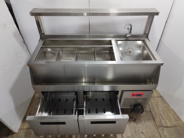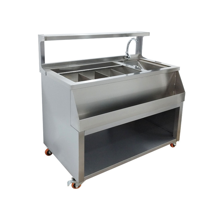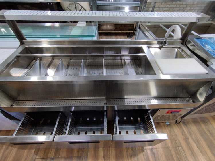 باراستیشن در اندازه ۱۲۰/۱۵۰/۱۸۹ سانت در ۸۵ سانت با جای بطری شیشه ای ، یک عدد سینک تک لگن ،پیجرشور، دارای جای تخته برای خورد کردن میوه و جای یخ ، دارای ۱۲ عدد بن ماری ۱/۶ برای ۱۵۰ سانت ، برای پرکردن میوه شکلات، تنقلات و ... زیر دستگاه یخچال دو درب تا دمای منفی ۳ درجه این دستگاه با استیل ۴۳۰ ضد زنگ میباشد با موتور امبراکو و درجه دیجیتال و نمایش گر دیجیتال میباشد دارای دستگاه بار استیشن با رف بالا که در آن میتوان مت بار هم گذاشت این دستگاه با وردی متصل به آب لوله کشی ، خروجی آب به فاضلاب میباشد