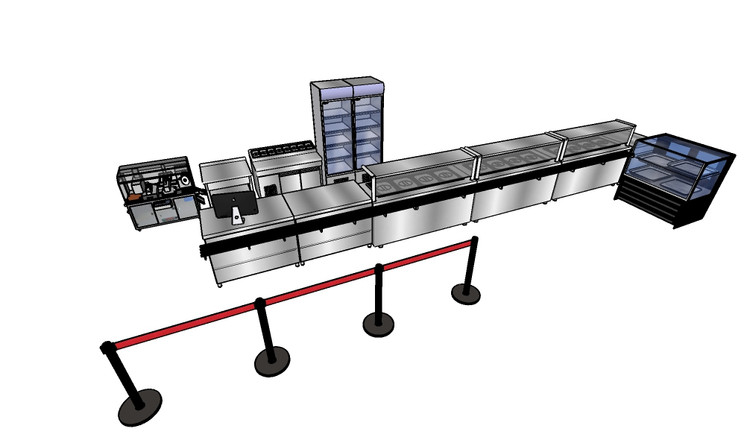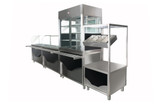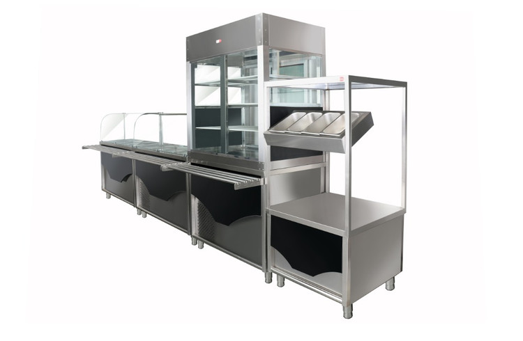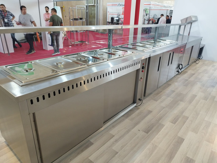 خط سلف سرویس ساخته شده از یک کانتر سرد برای سالاد بار یک کانتر گرم برای غذا انواع خورشت ،انواع کباب ، انواع ، برنج و چلو گوشت غیره یک عدد کاتر میز که برای ظروف استفاده میشود و یک عدد کانتر قاشق چنگال