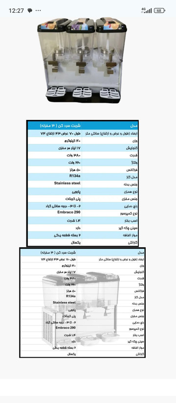 شربت سرد کن برند وان فور اور / ONE FOR EVER . ساخت چین قطعات ایتالیایی وزن ۴۰ کیلوگرم فرکانس ۵۰ هرتز سینی چکه گیر دارد گارانتی ۱12 ماهه بی قید و شرط قدرت ۱.۴ اسب بخار موارد اضافه ۲ بسته قطعات یدکی . نوع کمپرسور ۲۹۰ / embraceo . جنس مخزن پلی کربنات نشکن رنج دمایی ۲ الی ۳ منفی نوع همزن پارویی مدل گاز ۲۱۳۴ ولتاژ ۲۲۰ ولت کجایش مخزن ۱۷ لیتر . تعداد مخزن ۳ عدد • قدرت ۳۸۰ وات ولتاژ ۲۲۰ ولت . خدمات پس از فروش دارد . امکان خرید حضوری دارد دارای مجوز کاری اینترنتی اینماد خرید مستقیم و حذف واسطه